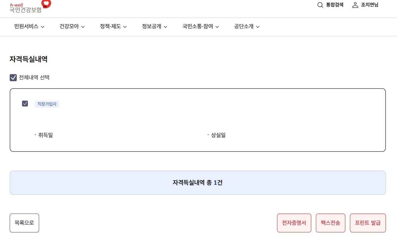 건강보험자격득실확인서 "직장가입사항"으로 출력이 되어야 하는데,