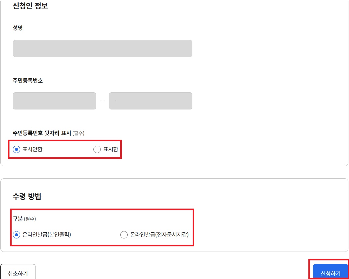 7. 로그인 후 주민등록 뒷자리 표시 여부와 수령방법 선택 후 신청하기 클릭